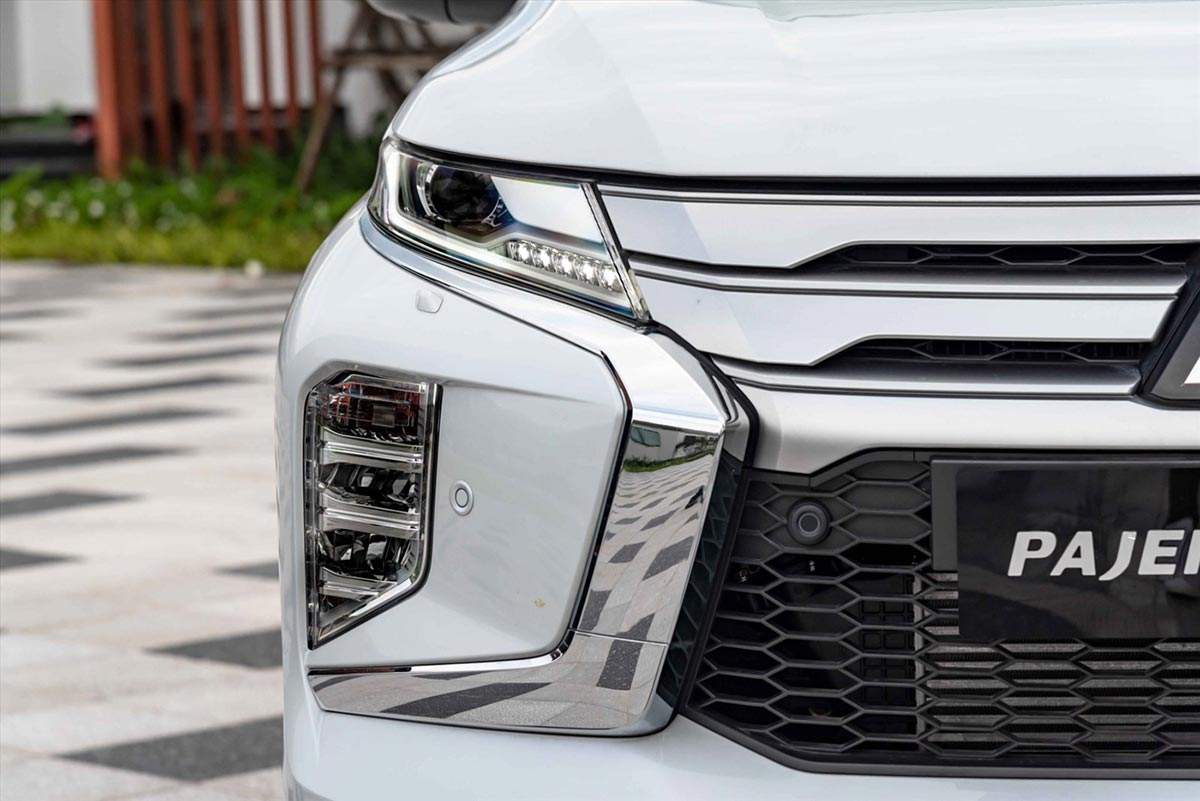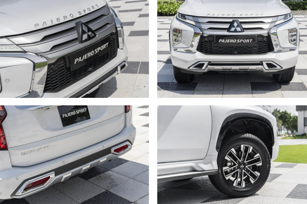 Phần đầu xe nổi bật với mặt ca lăng chữ X, hốc đèn 2 bên khoét sâu, bên trên là đèn chạy LED ban ngày và đèn pha nối liền bằng những thanh mạ bạc, giúp tăng thêm vẻ cứng cáp và nam tính cho Pajero Sport. Lưới tản nhiệt phía trước được thiết kế mới với 3 thanh ngang mạ bạc cao cấp làm tăng thêm vẻ cứng cáp, thể thao, mở rộng từ nắp ca-pô xuống giúp xe có khả năng làm mát động cơ tốt hơn. Đặc biệt, Pajero Sport mới được trang bị đèn chiếu sáng phía trước công nghệ Bi-LED hiện đại tăng hiệu quả chiếu sáng và thẩm mỹ, tích hợp công nghệ đèn chiếu sáng góc hỗ trợ tốt hơn khi vào cua.